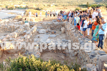 Η εκδήλωση ξεκίνησε με ξενάγηση στο χώρο των ανασκαφών από την Προϊστάμενη της ΚΔ’ ΕΚΠΑ, αρχαιολόγο Χρύσα Σοφιανού. Η αρχαιολογική σκαπάνη έφερε στο φως τρεις μεγάλες διώροφες οικίες σε τρία διαφορετικά σημεία δίπλα στην θάλασσα, που χρονολογούνται στην Υστερομινωική Ι περίοδο, γύρω στο 1500 π.Χ. μιας μινωικής πόλης που καταστράφηκε από άγνωστη μέχρι σήμερα αιτία. «Σε αυτό το χώρο έχουμε κάνει σωστικές ανασκαφές κυρίως στο παραλιακό μέτωπο. Οι ανασκαφές αυτές πραγματοποιήθηκαν με την χρηματοδότηση του INSTAP που εδρεύει στην Παχεία Άμμο. Μαζί με τον Διευθυντή του Ινστιτούτου, καθηγητή κ. Brogan, και με μια δυνατή ομάδα επιστημόνων μελετούμε τα ευρήματα. Τον επόμενο χρόνο θα κυκλοφορήσουν τα αποτελέσματα της έρευνας στην οικία Ι, στον πρώτο τόμο που θα εκδοθεί» είπε στην εισήγηση της η κα Σοφιανού.