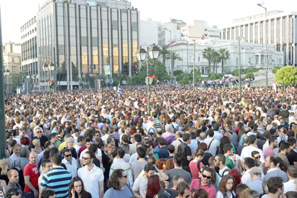 Μετά το «κύμα» αντιδράσεων που ξεκίνησε από την Ισπανία, τη σκυτάλη πήραν και οι Έλληνες διαδηλώνοντας ειρηνικά, χωρίς πανό και χωρίς εντάσεις.