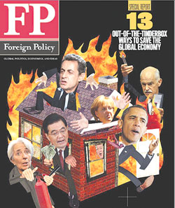Συγκεκριμένα, το τεύχος του “Foreign Policy” έχει ως κεντρικό αφιέρωμα την παγκόσμια οικονομία και προτείνει 13 τρόπους για να ξεπεραστεί η κρίση. Στο εξώφυλλο του περιοδικού όμως, δεσπόζουν οι φιγούρες του Νικολά Σαρκοζί, του Μπαρόζο, της Άνγκελα Μέρκελ, της Κριστίν Λαγκάρντ και του Μπαράκ Ομπάμα. Όλοι αυτοί φαίνονται να πετάγονται έξω από ένα φλεγόμενο σπίτι -που παρομοιάζει την παγκόσμια οικονομία- ενώ έξω από αυτό βρίσκεται ο ...Γιώργος Παπανδρέου. Ο πρώην πρωθυπουργός ως άλλος Νέρωνας φαίνεται να κρατά ένα σπίρτο στο ένα χέρι και το αγαπημένο του iPad στο άλλο, υπονοώντας προφανώς ότι βάζει φωτιά στο παγκόσμιο οικονομικό στερέωμα...